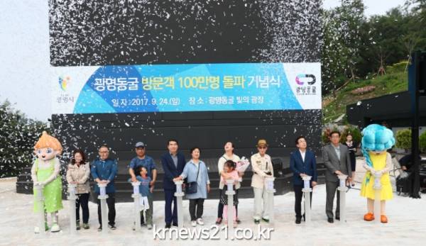 시는 이날 관광객 100만명 돌파 기념식을 갖고 100만 번째 입장객인 경기 광주시 이동남씨에게 선물과 기념품을 증정했다. 행운의 주인공인 이씨는 “부모님을 모시고 광명동굴에 방문했다가 큰 행운을 얻었다”며 “앞으로도 주변 지인들에게 광명동굴을 널리 알리겠다”고 말했다.