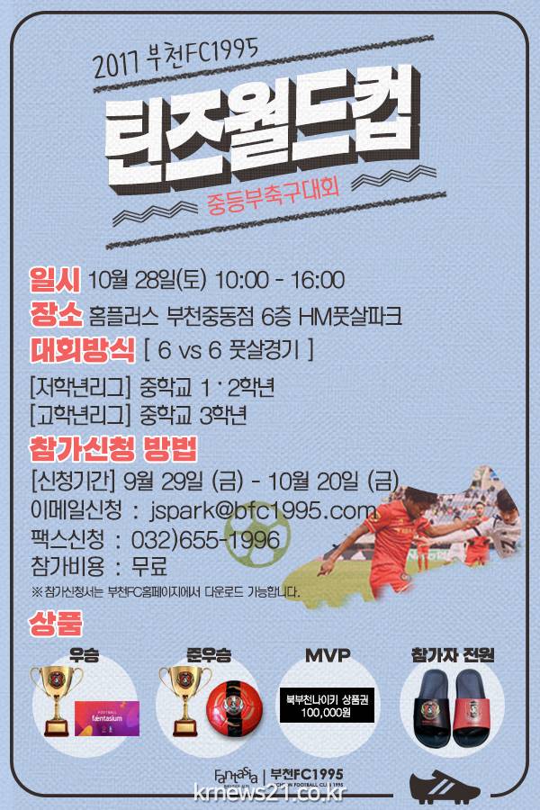 부천FC1995가 부천시의 축구 저변 확대와 건강한 청소년 양성을 위해 중학교 클럽(아마추어) 학생을 대상으로 2017 부천FC 틴즈 월드컵을 개최한다.