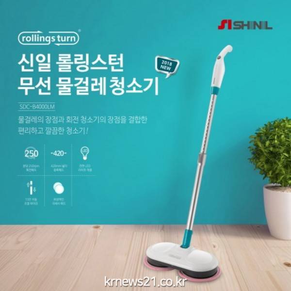 이번 신제품은 58년 역사를 자랑하는 신일산업의 우수한 모터 기술을 적용해 힘을 들이지 않아도 깔끔한 물걸레 청소를 할 수 있다. 420mm의 넉넉한 사이즈의 2개의 광폭헤드는 분당 250rpm의 회전력을 발휘한다.