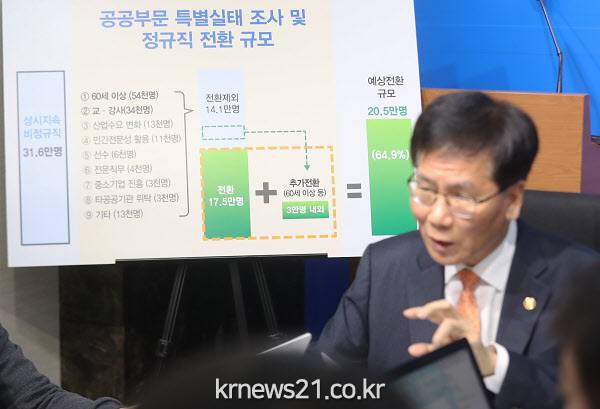 구체적인 전환 계획을 보면 공공부문에서 상시·지속적 업무를 수행하는 비정규직 31만 6000 명 가운데 65%인 20만 5000명이 2020년까지 정규직으로 전환된다. 이 중 7만 4000 명(기간제 5만1000명, 파견·용역 2만 3000명)은 올해 안에 정규직으로 바뀔 예정이다.