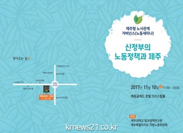 제주특별자치도지방노동위원회(위원장 김승희)과 제주대학교 법과정책연구원(원장 오성근) 공동 주최로 오는 10일 메종글래드 제주호텔에서 노사관계 전문가, 노사단체 등 200여명이 참석한 가운데 '제주형 노사관계 거버넌스'를 개최한다.