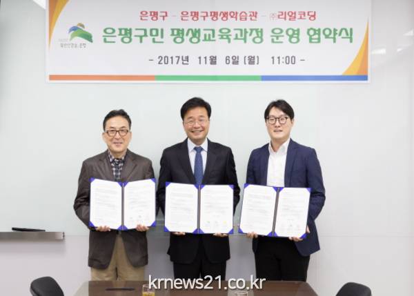 은평구-은평구평생학습관-(주)리얼코딩은 협약을 통해 차세대 필수언어인 코딩전문가를 양성하는 강사 교육과정과 지역 청소년을 대상으로 코딩을 교육하는 온라인 과정을 차년도에 운영하기로 뜻을 모았다.
