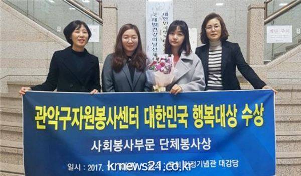 관악구(구청장 유종필)는 지난 10일 국회헌정기념관 대강당에서 열린 ‘대한민국 행복대상’ 시상식에서 사회봉사부문 단체봉사상을 받았다고 13일 밝혔다. 지난달 '2017서울시 봉사상’에서 우수상 수상에 이은 또 한번의 쾌거다.