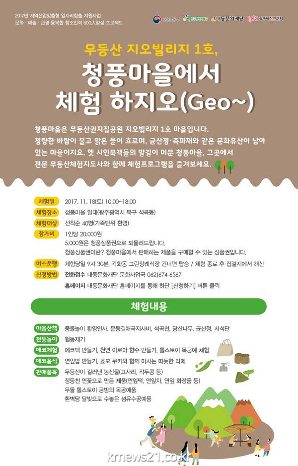 광주시 북구(청장 송광운)가 무등산권 지질공원 세계화 사업이 본격화되면서 ‘지오(Geo)빌리지 1호’로 선정된 청풍마을에서 체험프로그램이 진행된다