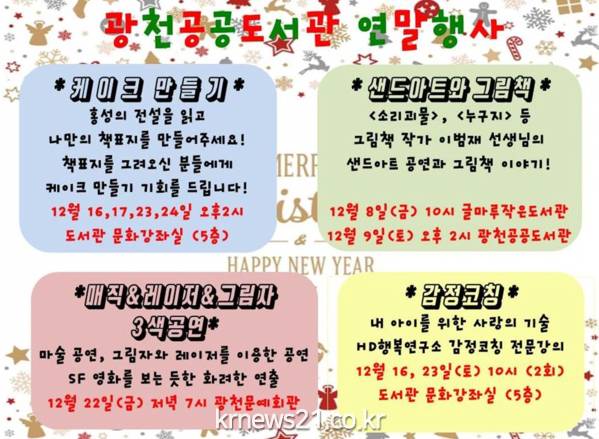 홍성군 광천공공도서관에서 연말을 맞이하여 다양한 행사를 마련해 지역주민들의 독서문화 진흥과 따뜻한 연말 분위기를 조성하고자 한다.