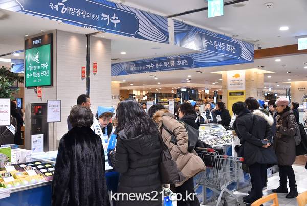 △지난 15일부터 21일까지 서울 롯데백화점 강남점에서 열린 여수 농수특산품 초대전에 소비자들이 관심을 보이고 있다.