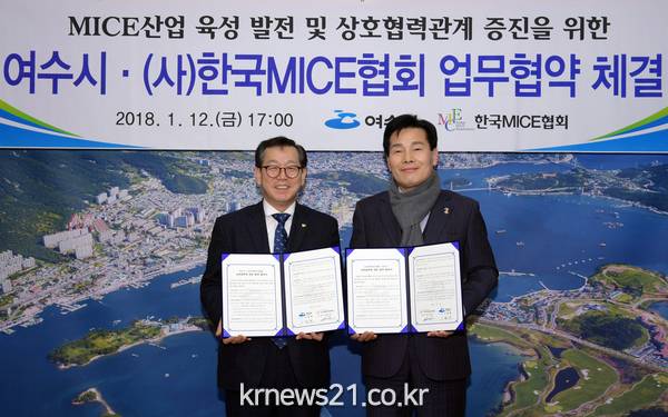여수시에 따르면 12일 오후 시청 시장실에서 주철현 여수시장과 김응수 (사)한국MICE협회장이 MICE 활성화 업무협약을 체결했다.