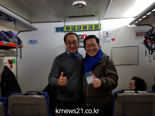 기차 안에서 이성만 위원장의 인사말에 이어 국회 사무총장인 김교홍 의원 박남춘 국회의원