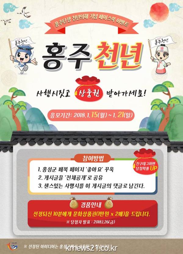 군 관계자는 “이벤트를 통해 2018년 홍주 탄생 천년의 해를 널리 알리고 군민의 참신하고 획기적인 사행시를 채택하는 것은 물론, 페이스북을 통한 군정홍보와 회원 수 증대 역시 기대하고 있다.”고 말했다.