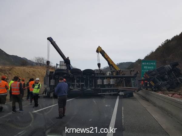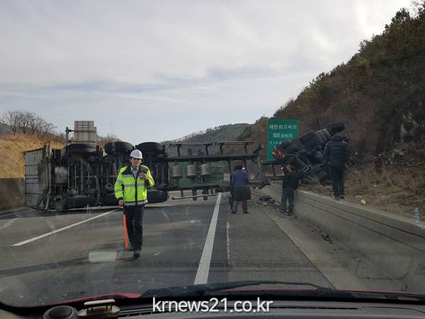 운전자는 경미한 부상으로 병원 이송은 되지 않았으나 현장은 약 3km 정체 중이므로 국도로 우회 바랍니다.