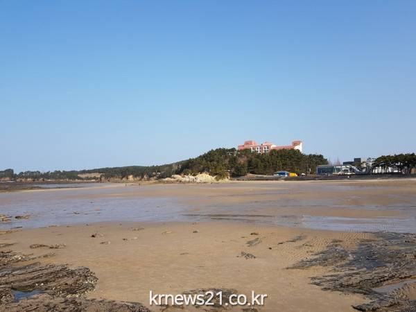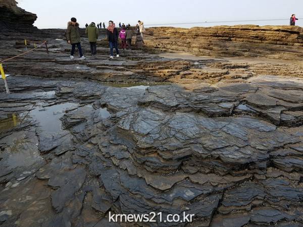 변산반도 격포 해수욕장과 바닷물에 침식되어 오랜 시간 쌓여 만들어진 채석강의 모습.
