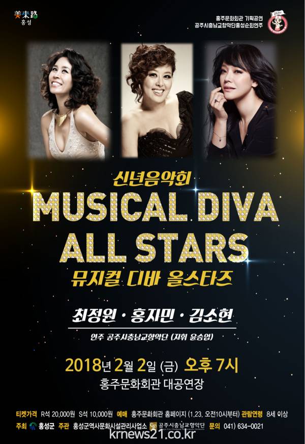 홍성군은 2018년 홍주지명 천년의 해를 맞아 오는 2월 2일(금) 오후 7시 홍주문화회관 대공연장에서 신년음악회 <뮤지컬 디바 올스타즈>를 개최한다.