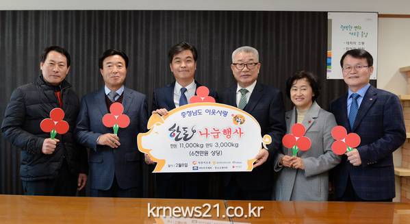 | 충남도 내 양돈농가들이 올해 설 명절에도 어김없이 형편이 어려운 이웃들을 위해 우리 돼지고기 ‘한돈’을 쾌척, 도내 대표적인 기부캠페인으로 자리매김하고 있다. 도는 8일 ㈔한돈협회 충남도협의회(회장 최상락)와 대전충남양돈농협(조합장 이제만)이 돼지고기 10톤과 고기만두 500박스를 윤원철 도 정무부지사에게 전달했다고 밝혔다. 이날 기탁한 돼지고기와 고기만두는 양돈농가들이 돼지를 키우며 조성한 자조금과 대전충남양돈농협의 협찬으로 마련했다. ㈔한돈협회 충남도협의회는 매년 설 명절에 대전충남양돈농협과 함께 돼지고기와 고기만두 등 6000만 원 상당을 어려운 이웃들을 위해 기탁해 오고 있다. 도는 이날 기탁받은 물품을 사회복지공동모금회 충남도지회를 통해 도내 소외 이웃들에게 전달할 예정이다. 최상락 충남한돈협회장은 “이번 기탁은 민족의 대명절 설을 앞두고 우리 주위에 소외되고 어려운 이웃과 위생적이고 맛좋은 우리 돼지고기 한돈과 고기만두를 함께 나누고자 마련했다”며 “앞으로도 더불어 사는 공동체를 만드는데 조금이나마 보탬이 될 수 있도록 힘을 모을 것”이라고 말했다. 이제만 대전충남양돈조합장은 “설 명절을 앞두고 충남한돈협회와 뜻깊은 자리를 마련했다”며 “앞으로도 충남도 내 양돈농가와 이웃이 함께 어우러질 수 있는 노력들을 계속하겠다”고 전했다. |