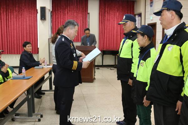 아동안전을 위해 노력하는 아동안전지킴이들에게 서장 이 재홍은 감사를 표하고 있다.