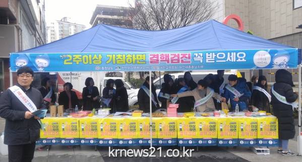 도는 21일 ‘결핵 예방의 날(3월 24일)’을 앞두고 천안 고속버스터미널 앞 광장에서 결핵 예방 캠페인을 실시했다.