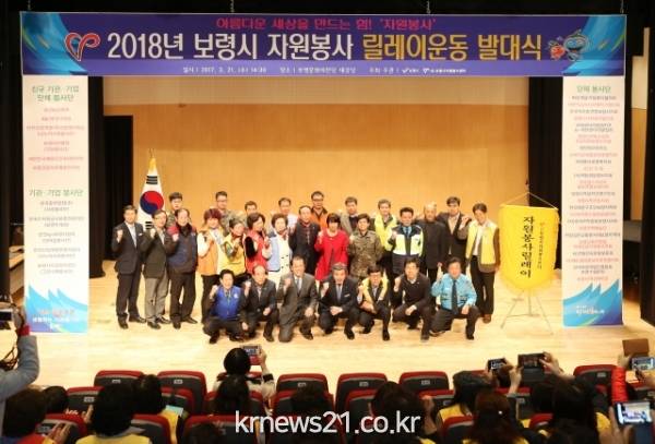 보령시는 21일 오후 보령문화의전당 대강당에서 김동일 시장과 박상배 시의회 의장, 구영회 자원봉사센터 이사장, 자원봉사 기관・단체 회원 등 250여 명이 참석한 가운데 2018년 보령시 자원봉사 릴레이봉사단 발대식을 개최했다.