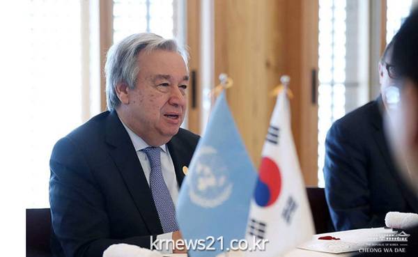 ▲ 안토니오 구테헤스 (Antonio Guterres) 유엔 사무총장(사진=청와대)유엔 사무국은 21일 사무총장 대변인 명의의 성명을 내고 북한의 핵 실험 및 ICBM 시험발사 중단 결정을 환영했다.