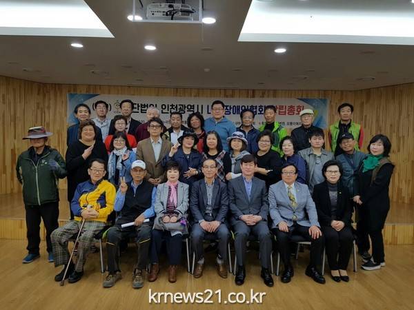 ((인천 내부 장애인 창립총회가 인천 주안병원 에서 개최.가족들과 회원들이 모여서 사진을 찍다.))