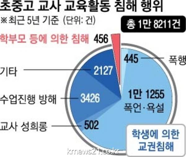 해마다 험악해지는 교권 침해 사건도 교사들을 맥빠지게 한다. 교육부에 따르면 지난해까지 최근 5년간 폭행, 폭언·욕설, 성희롱, 수업방해 등 학생, 학부모 의한 교육 침해 행위는 모두 1만 8211건으로 집계됐다.