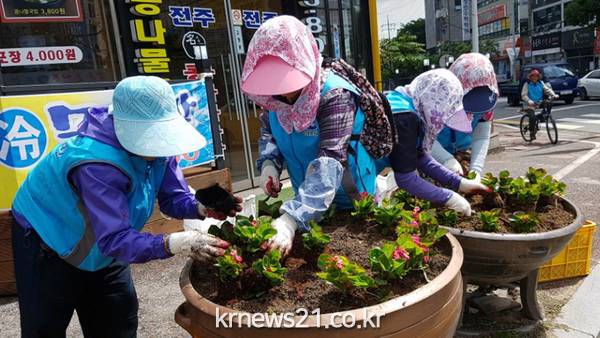 △지난 23일 여수시 문수동 주민들이 도로변 화분에 여름꽃인 베고니아를 심고 있다, 문수동 주민자치