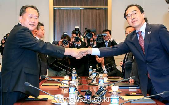 ▲ 조명균 통일부 장관(오른쪽)과 리선권 조국평화통일위원회 위원장이 1일 오전 판문점 남측 평화의집에서 열린 ‘남북고위급회담’에 참석해 악수를 나누고 있다.(사진=통일부)남북 장성급 군사회담은 이달 14일 판문점 통일각에서, 오는 8월에 열릴 아시안게임 공동참가 등을 논의하기 위한 체육회담은 18일 판문점 평화의집에서 열기로 했다.