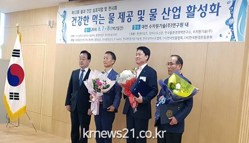 △지난 7일 하헌옥 여수시 상수도과장(왼쪽 두 번째)이 대전 수자원기술㈜ 연구원에서 열린 제12회 물과 건강 심포지엄에서 물 관리 최우수기관상을 받고 있다.