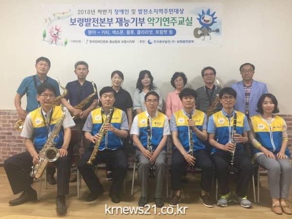 한국중부발전(사장 박형구) 보령발전본부(직무대행 임오식)는 6월 19일, 주교리에 위치한 장애인문화협회 사무실에서 장애인들과 지역주민들을 대상으로 악기연주교실 재능기부 봉사활동을 시행했다. 이번 행사는 장애인문화협회에서 요청하고 악기연주에 재능이 있는 보령발전본부 직원들이 이에 부응하여 함께 강사로서 참여하게 되었으며, 악기연주교실을 통해 장애인들과 참여주민들의 심신을 단련하고 정서장애를 치유하여 지역 안에서 상생하는 공동체를 이루기를 바라는 마음으로 진행하게 되었다. 보령발전본부 직원들은 앞으로도 소외된 지역을 직접 찾아가 악기연주공연을 통해 지역주민들의 활기차고 생동감 있는 삶을 회복하도록 더욱 알찬 사회공헌활동이 될 수 있도록 최선을 다하겠다.