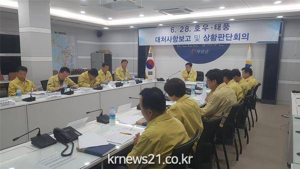 이번 상황판단회의는 장영식 부군수 주재로 실시하여 6월 28일 집중호우로 발생한 농경지 침수 점검 및 재발방지 대책을 수립하는 한편 13개 기능별 협업부서의 태풍 대비 조치사항 및 대처계획을 공유했다.