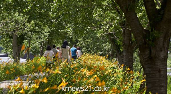 구례군 섬진강 서시천변에 100만 송이 원추리꽃이 군락을 이루며 주민과 관광객을