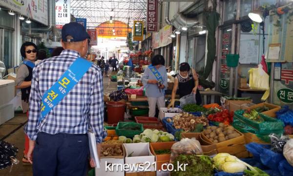 △지난 12일 여수시 쌍봉동 통장들이 인근 전통시장에서 식재료 등을 구입하고 있다.