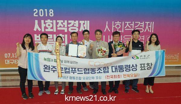 ▲ 로컬푸드협동조합수상(전북/뉴스21)송태규기자= 완주로컬푸드협동조합이 기획재정부 주관 ‘2018년도 협동조합 유공자 포상’에서 대통령 표창을 수상, 명실상부한 전국 최우수 협동조합으로 인정받았다. 16일 완주군에 따르면 이번 포상은 기획재정부에서 지역 일자리 창출, 사회서비스 제공 등 사회적경제에 대한 국민 인식제고와 성공모델 구축・확산을 위해 마련된 것으로, 협동조합으로 대통령 표창은 완주로컬푸드협동조합이 처음이다. 그동안 완주로컬푸드협동조합은 로컬푸드 생산과 소비를 촉진할 수 있는 지역시장을 확충하고 마을회사의 6차산업화를 촉진·견인해 왔다. 또한, 농가가 직접 재배한 농산물과 농민 가공센터를 통해 가공품을 생산하고 로컬푸드직매장에 스스로 진열판매까지 하는 유통방식을 도입해 종래의 농산물 유통구조에 대한 고정관념을 깨뜨렸다. 이외에도 협동조합에서 운영 중인 6개 로컬푸드직매장에서는 당일 수확한 상품을 판매하고, 3개 농가레스토랑에서는 농가계약재배로 건강한 식재료를 공급하고 있다.