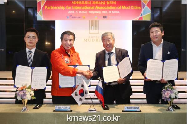또한 15일에는 김 시장과 아우쉬프 알렉산더 러시아 부리야트공화국 울란우데 정부대표(부시장)와 피터 에르타노프 부리야트 상공회의소 회장 등 러시아측 관계자와 최범수 ㈜바이칼 네이처 대표이사, 안일용 시크릿다이렉트코리아(주) 총괄이사, 홍현욱 (유)바이칼 크리스탈 대표이사 등 기업 관계자 등이 참석한 가운데 세계머드도시연합 공식 출범을 위한 세계머드도시 파트너십 협약식을 가졌다.