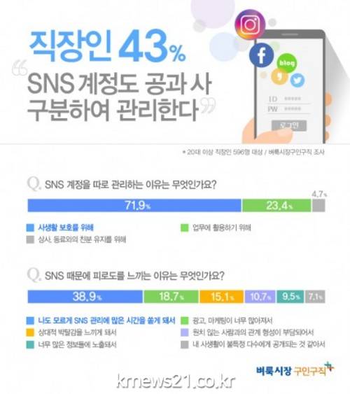 미디어윌이 운영하는 벼룩시장구인구직이 SNS를 사용하는 직장인 596명을 대상으로 설문조사를 진행한 결과 43%가 ‘회사용 SNS를 따로 관리하고 있다’고 답했다.