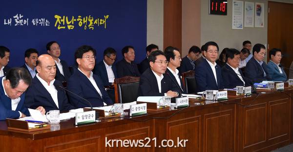 △권오봉 여수시장(앞줄 왼쪽 네 번째)이 20일 오전 전남도청 서재필실에서 열린 민선7기 도지사-시장·군수 상견례 및 협력간담회에 참석해 발언하고 있다. 이날 전남도와 22개 시군은 일자리 창출과 청년 창업지원 등에 적극 협력키로 했다.