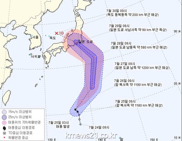태풍 '종다리'는 느린 속도로 북상하고 있어 26일이나 27일 쯤 괌 북서쪽 해상을 지날 것으로 전망된다. 그러나 속도가 빨라져 29일 오전 일본 도쿄 부근을 강타한 뒤 30일 동해로 올 가능성이 크다.