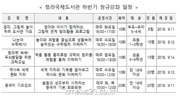 ▲ (사진=인천광역시청)인천광역시(시장 박남춘) 청라국제도서관은 인천시민을 대상으로 9월부터 11월 까지 지역주민의 평생교육을 지원하기 위한 교육·문화 장기 프로그램인 2018년 하반기 정규강좌 수강생을 8월 9일(목) 오전 9시부터 선착순 모집한다.