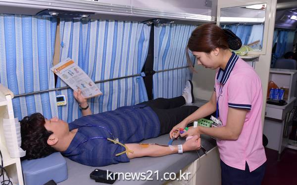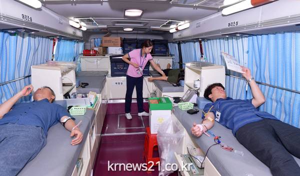 △7일 오전 여수시청 현관 이동헌혈차량에서 시 공무원들이 생명 나눔 문화 확산을 위해 헌혈하고있다