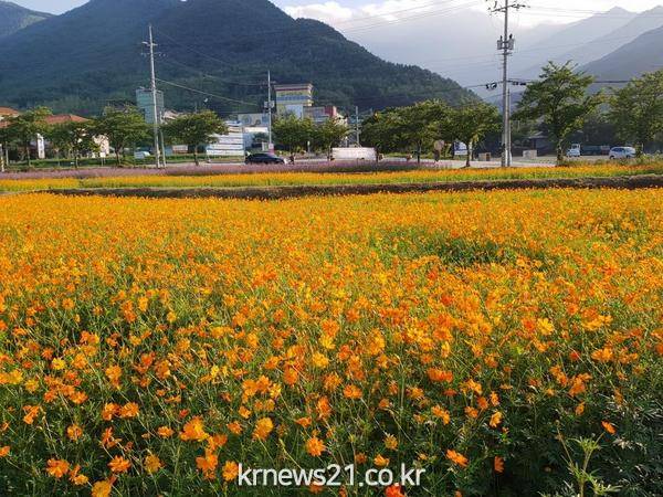 마산면 발전위원회 측은 폭염에도 불구하고 회원들의 헌신적인 협조로 대규모의 꽂밭을 조성