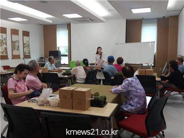 프로그램은 농업기술센터 2층 강의실에서 치매환자 가족 10여명과 ‘색모래를 이용한 테라리움 꾸미기’ 라는 주제로 원예치료를 운영했다. 농업기술센터와 연계한 원예치료는 5월부터 8월까지 총 4회기로 구성됐으며 치매환자 가족의 마음 이해하기, 돌봄 정보와 경험 공유하기, 식물 소개 및 테라리움 꾸미기, 참여 소감 말하기 등으로 진행됐다.