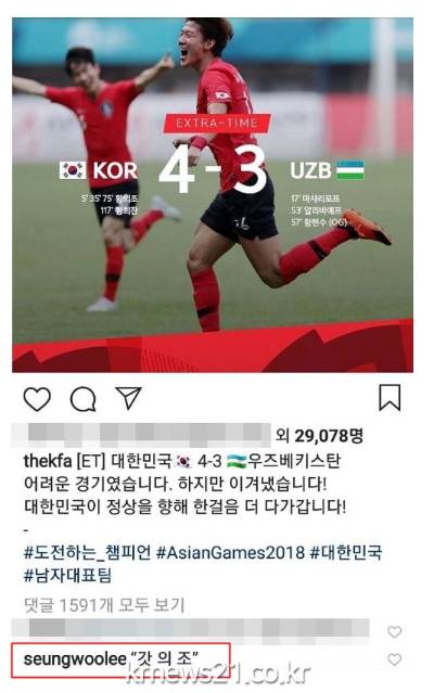 ▲ (사진=대한민국축구협회 인스타그램)한국 축구 대표팀이 연장 끝에 우즈베키스탄을 제치고 4강에 진출한 가운데, 이승우가 대한축구협회 인스타그램에 귀여운 댓글을 남겼다.