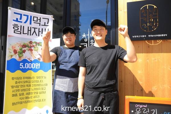 ▲ 청년키움식당4차참가팀(전북/뉴스21)송태규기자= 외식창업을 희망하는 청년들의 꿈을 키우는 청년키움식당 4차 참가팀이 운영을 시작했다. 6일 완주군에 따르면 9월 한달간 청년키움식당을 책임질 4차 참가팀은 2명의 대학생들이 꾸려가고 있는 랑식당이다. ‘손님이랑 셰프’의 의미를 가지고, 손님과 소통하며 최고의 음식을 만들기 위해 노력하겠다는 마음으로 지은 팀명이다. 랑식당의 주메뉴는 유린기국수, 유린기덮밥, 로컬카레유린기덮밥이다. 유린기는 바삭하게 튀겨낸 닭고기에 아삭한 채소, 입맛 돋우는 비법 특제소스가 어우러진 음식이다.