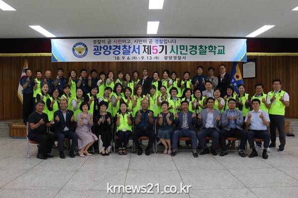 ○ 지난 6일 광양경찰서 4층 대회의실에서 경찰서장, 각 과장 및지구대‧파출소장, 시민경찰학교 교육생 등 60여명이 참석한 가운데 민‧경 공동체치안 활성화를 위한 ‘제5기 시민경찰학교’ 입교식을 개최했다.