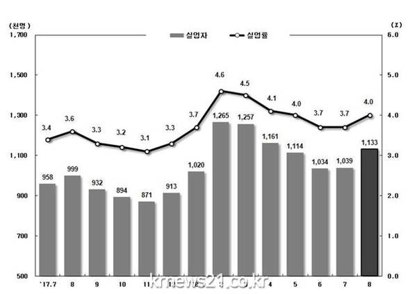15~29세 청년실업률은 10.0%로 전년 동월 대비 0.6%p 상승하며 8월 기준 1999년(10.7%) 이후 가장 높았다.