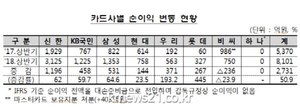 금융감독원은 13일 발표한 ‘2018년 상반기 신용카드사 영업실적’을 통해 8개 전업 카드사의 순이익이 8101억원으로 지난해 상반기(5370억원)보다 50.9% 늘었다고 밝혔다.