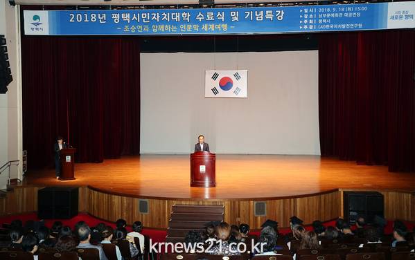 평택시(시장 정장선)는 지난 18일 남부문화예술회관에서 시민 300여명이 참석한 가운데 2018년 평택시민자치대학 수료식 및 조승연 작가의 인문학 특강을 진행했다.