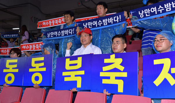 △20일 권오봉 여수시장이 광주 기아챔피언스필드에서 열린 기아와 NC의 프로야구 경기 시구 후 관중석에서 2018 여수동동북축제를 홍보하고 있다.