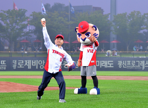 △20일 권오봉 여수시장이 광주 기아챔피언스필드에서 열린 기아와 NC의 프로야구 경기에 앞서 시구하고 있다.