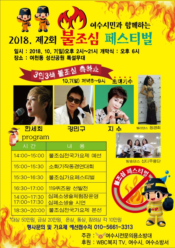 오는 10월7일 여수시 화장동 성산공원에서 오후 2시부터 9시까지 여수시 여천동 성산공원 특설무대에서 불조심 페스티벌을 개최해 시민과 함께 화재예방에 총력을 기울일 예정이다.