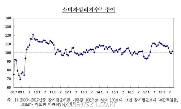100보다 클 경우 경제 상황에 대해 낙관적으로, 100보다 작을 경우 비관적이라는 뜻이다.