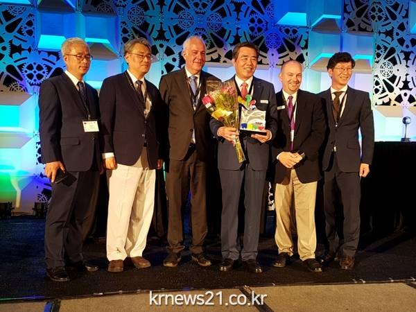 ▲ 제63회 세계축제협회 총회에서 2018년 세계축제도시로 선정되 김동일 보령시장 공식깃발과 인증패를 받는장면
